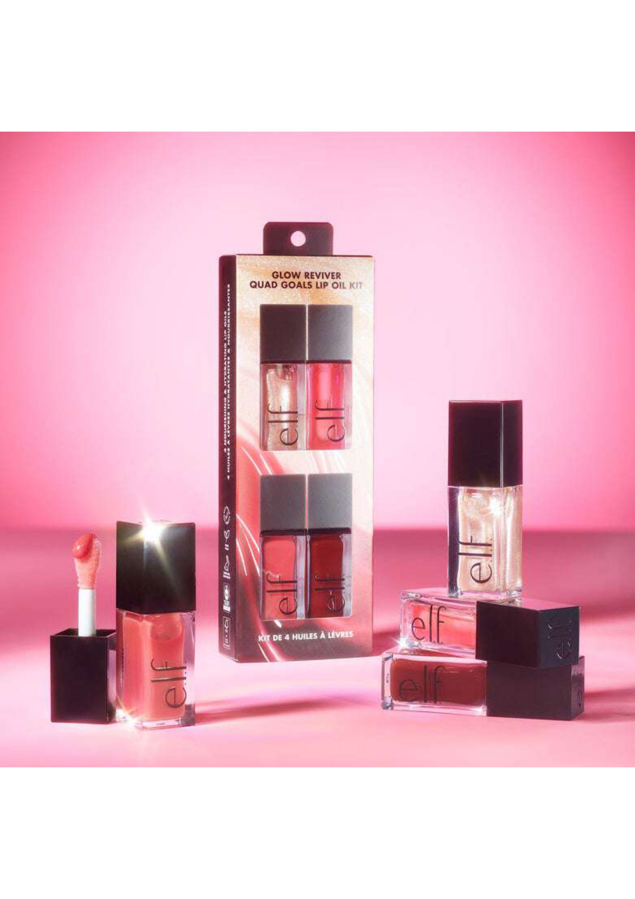 What it is: e.l.f Glow Reviver Quad Goals lip oil kit features Glow Reviver Lip Oil in 3 best-selling shades and 1 NEW glimmer finish for an ultra-shiny, nourished pout.